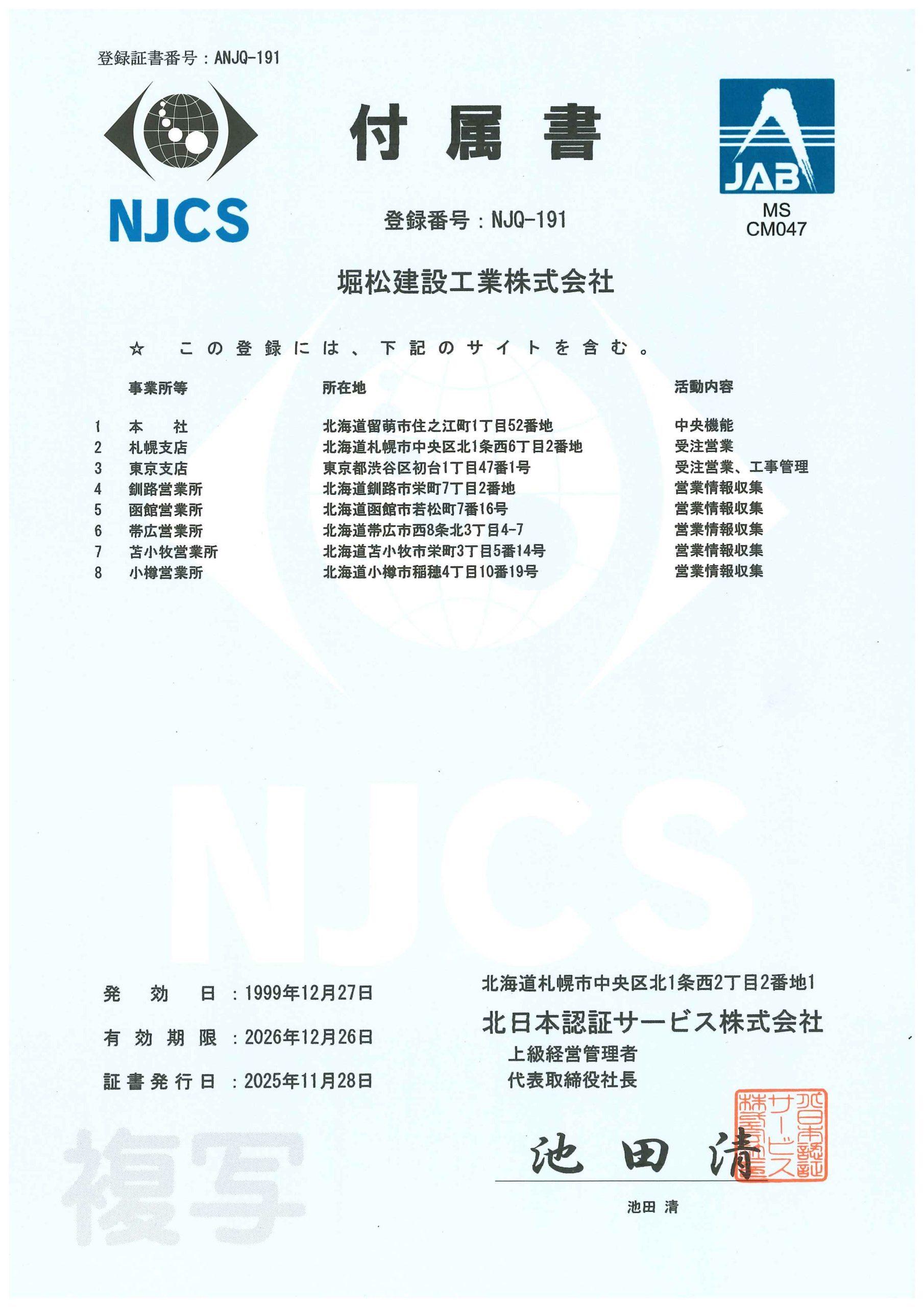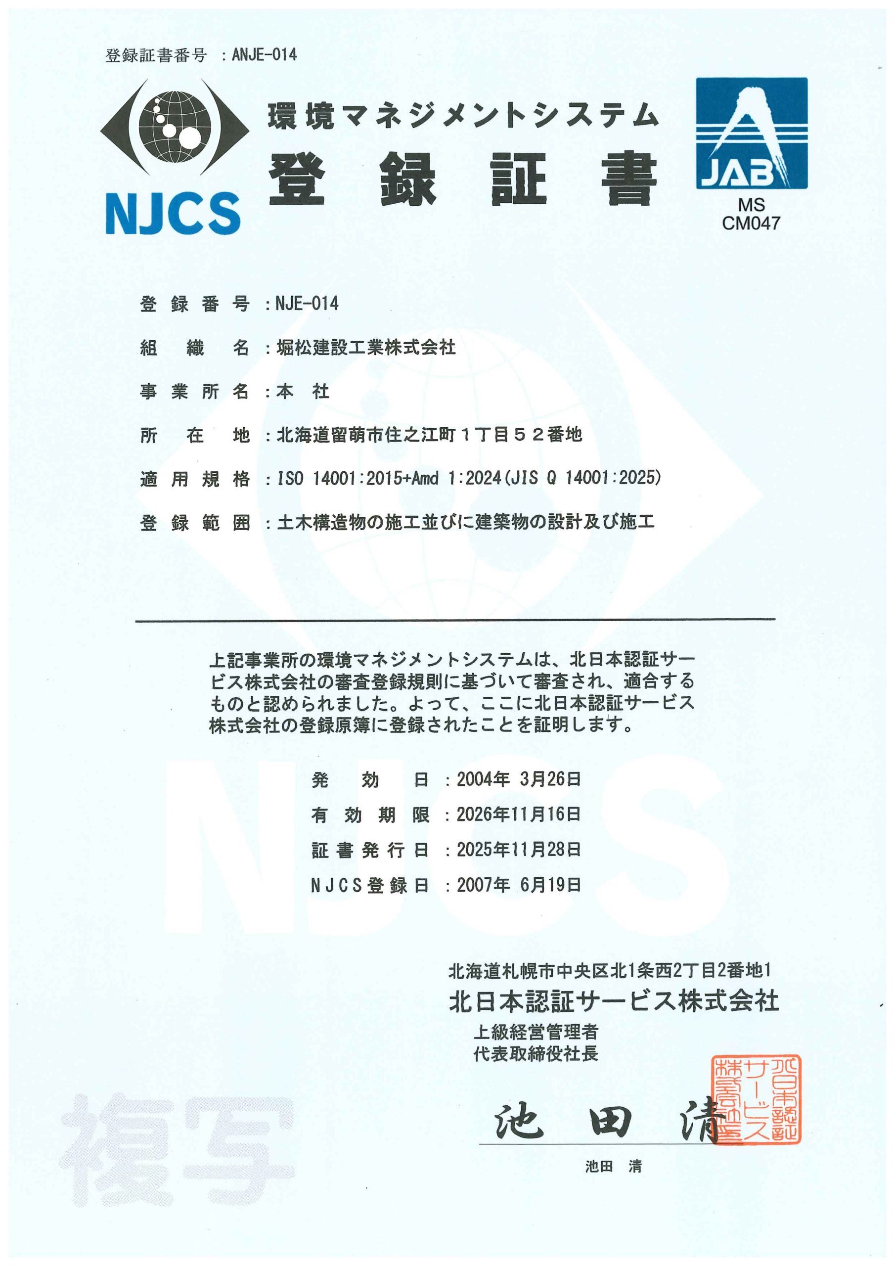 深刻化する地球環境問題を世界中が一致して食い止めようと、環境を管理するための国際規格「ISO14001環境マネジメントシステム」を2004年(平成16年)3月に認証取得しました。このシステムに基づき、工事の施工にあたり、環境への影響を事前に調べ、悪影響を最小限に押さえるための様々な活動を行っております。
