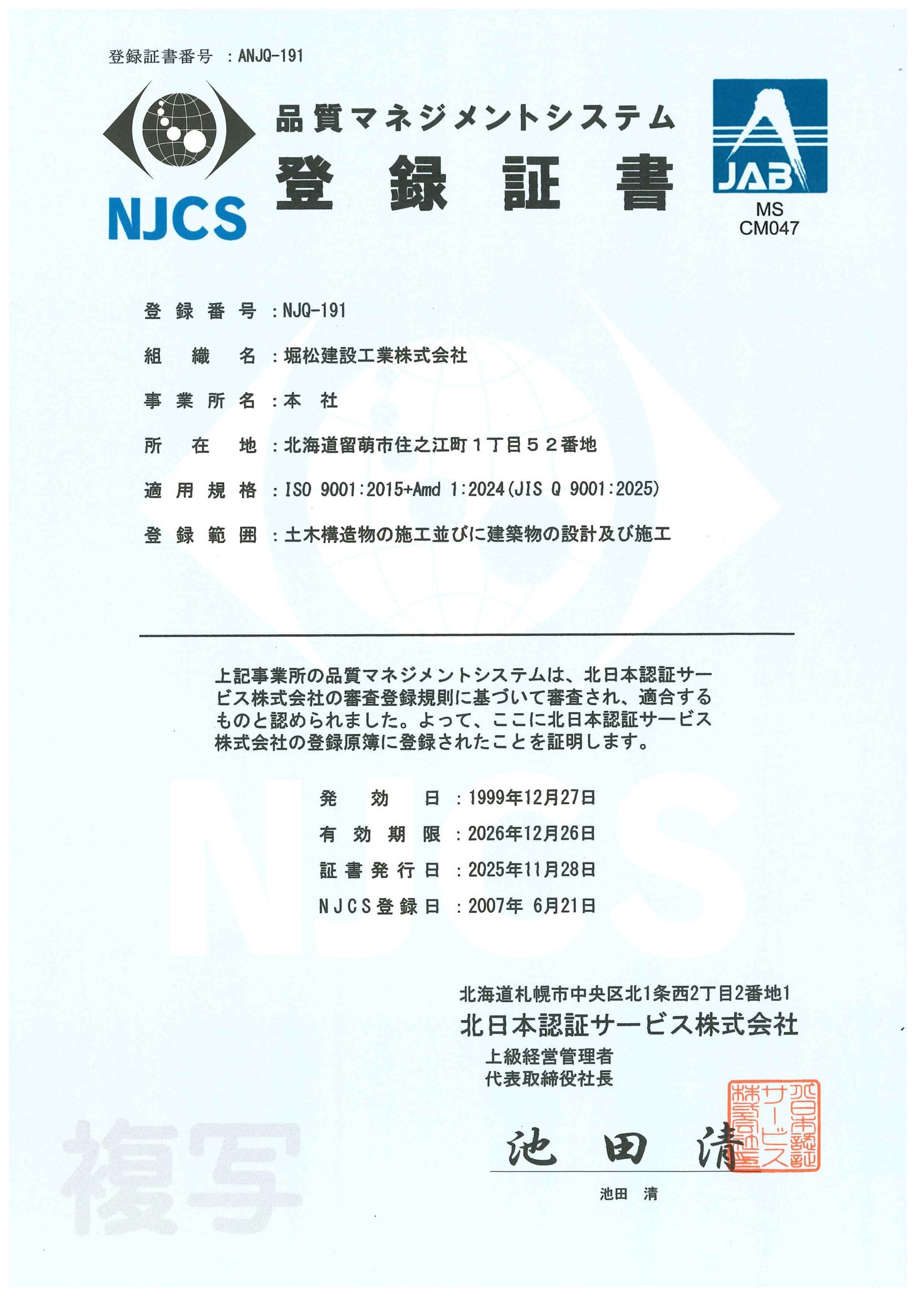 世界中で同じ品質、同じレベルのものを提供できるようにする国際規格「ISO9001品質マネジメントシステム」を1999年(平成11年)12月に認証取得しました。このシステムに基づき、良い製品とサービスの提供、顧客満足向上、継続的改善などの様々な活動を行っております。